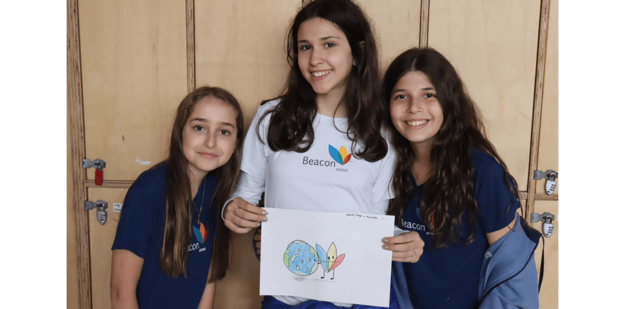 Assim, foi o desenho produzido pelas alunas Maya, Rafaela e Stela, do Y6D, que se destacou pois, representando a Beacon abraçando o planeta de acordo com elas, “mostra que a Beacon cuida da Sustentabilidade”.