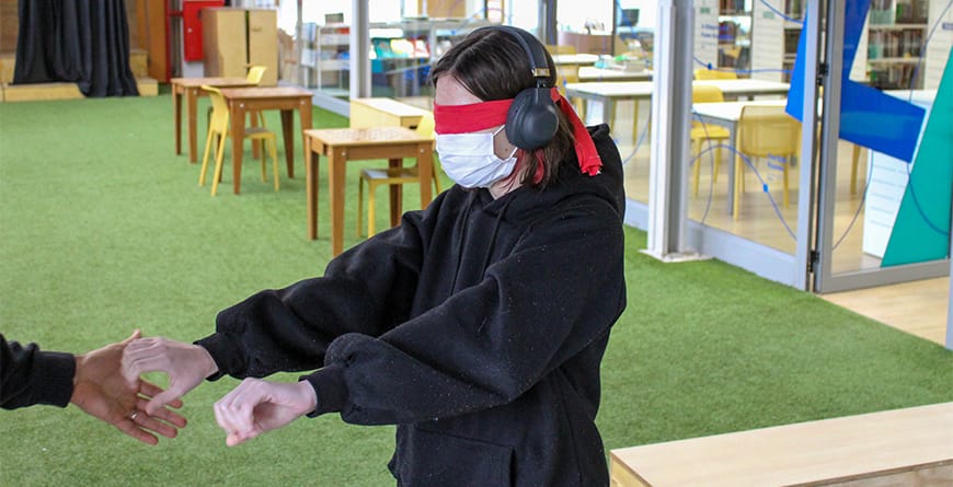 Durante o primeiro módulo, os jovens foram convidados a uma prática sensorial que teve como propósito justamente o de dar um pontapé sensível para iniciar os trabalhos. Anulando a visão e utilizando-se apenas do som (ruído ambiente de floresta) e tato (pés), eles percorreram um percurso de chão de cimento de dentro da escola até o gramado e, em seguida, pisaram em uma poça de lama.