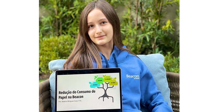 Beatriz, a 7th grade student (Y7), observing the issue of sustainability, voluntarily decided to measure the use of paper by students at the school. By collecting much information and performing significant analysis, she prepared a presentation which had details on consumption, reasons for reducing use and alternative proposals to physical notebooks.